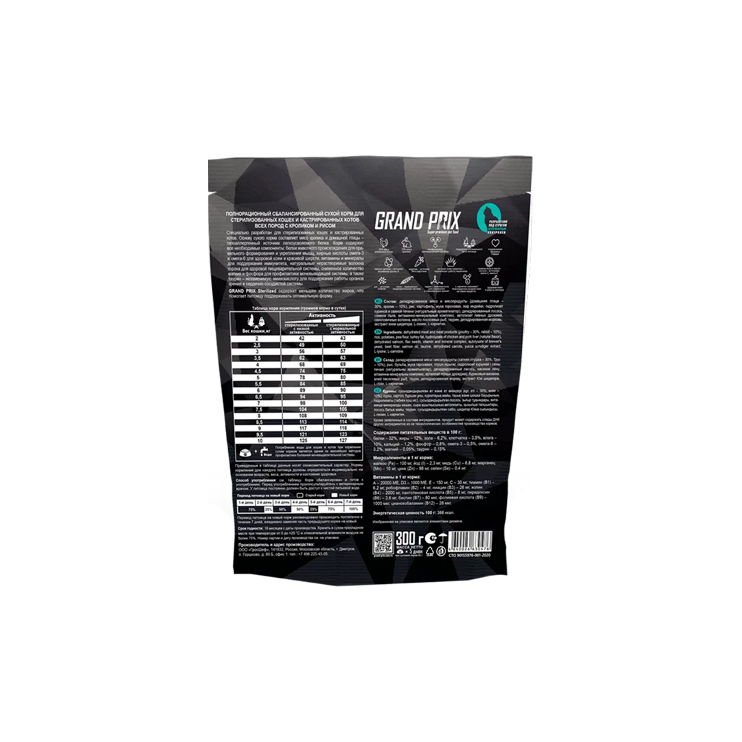 GRAND PRIX полнорационный сбалансированный корм супер-премиум класса для стерилизованных кошек и кастрированных котов всех пород с кроликом и рисом.