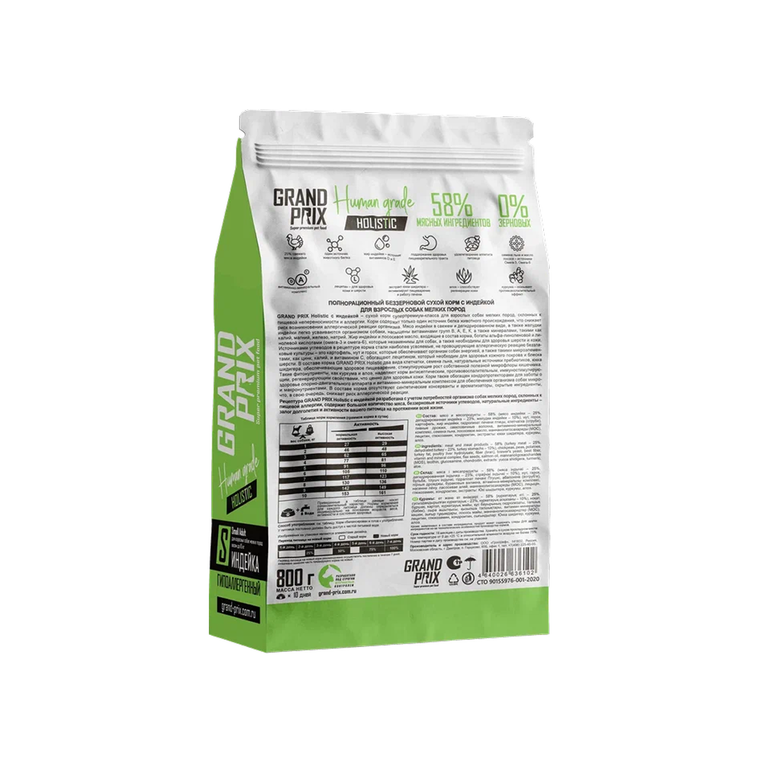 В составе корма GRAND PRIX Holistic Dog два вида клетчатки, семена льна, натуральные источники пребиотиков, юкка шидигера, обеспечивающие здоровое пищеварение, стимулирующие рост собственной полезной микрофлоры кишечника. Такие фитонутриенты, как куркума и алоэ, наделяют корм антисептическим, противовоспалительным, иммуностимулирующим, регенерирующим свойствами, что ценно для здоровья кожи. Корм также обогащен хондропротекторами для заботы о здоровье опорно-двигательного аппарата и витаминно-минеральным комплексом для обеспечения организма собак микро- и макронутриентами. В составе корма нет синтетических консервантов и ароматизаторов, скрытых ингредиентов, что, в свою очередь, снижает риск аллергической реакции.