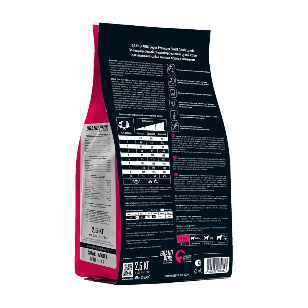 - Купить на Мега Маркет https://megamarket.ru/promo-page/details/#?slug=suhoy-korm-grand-prix-small-adult-dlya-vzroslyh-sobak-melkih-porod-yagnenok-25-kg-600000068155&merchantId=1870